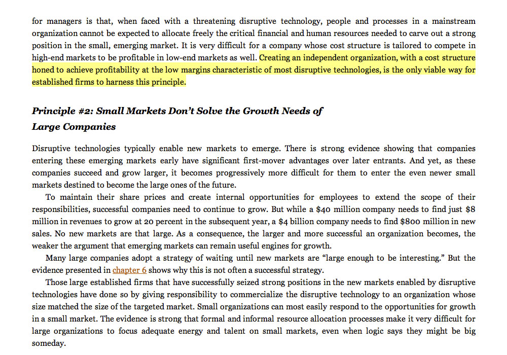 “Cost structure honed to achieve an independent organization, with a cost structure honed to achieve profitability at the low margins characteristic of most disruptive technologies, is the only viable way for established firms to harness this principle.”