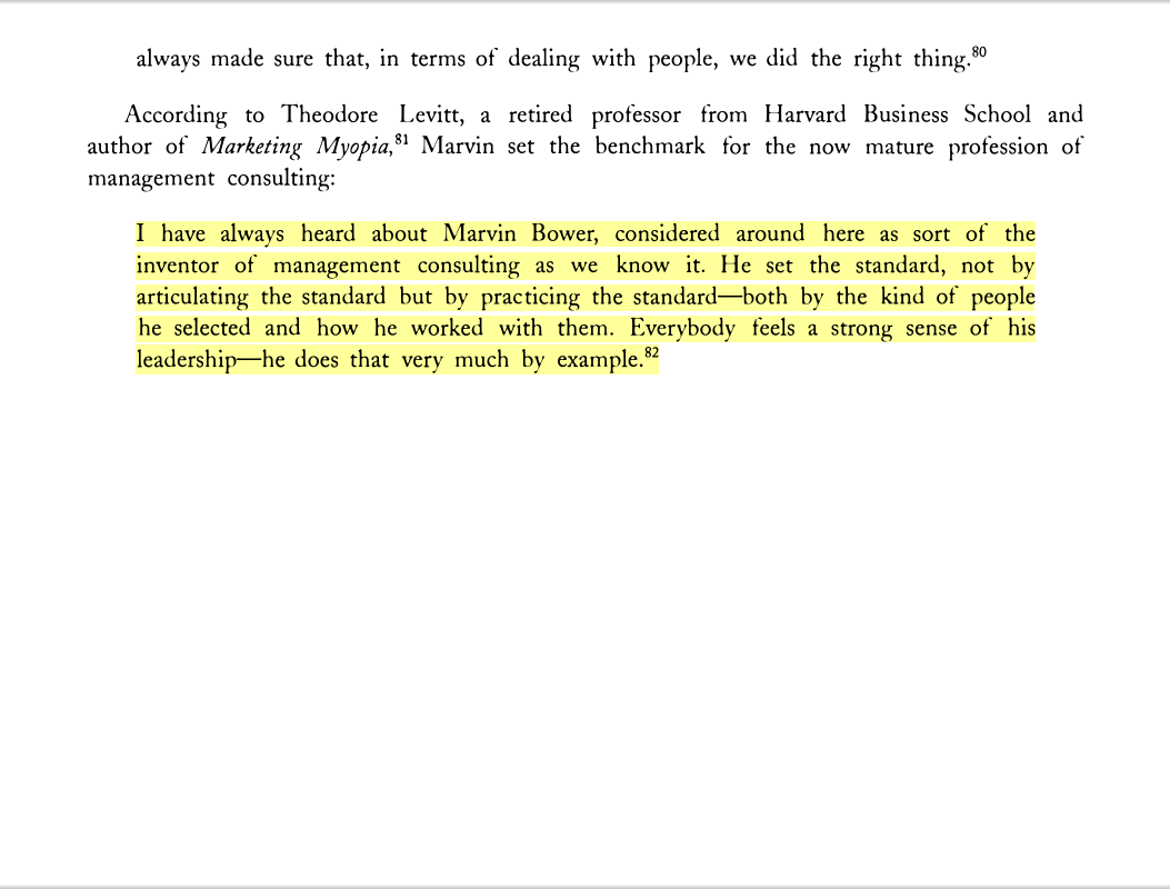 “I have always heard about Marvin Bower, considered around here as sort of the inventor of management consulting as we know it. He set the standard, not by articulating the standard but by practicing the standard—both by the kind of people he selected and how he worked with them. Everybody feels a strong sense of his leadership—he does that very much by example.”