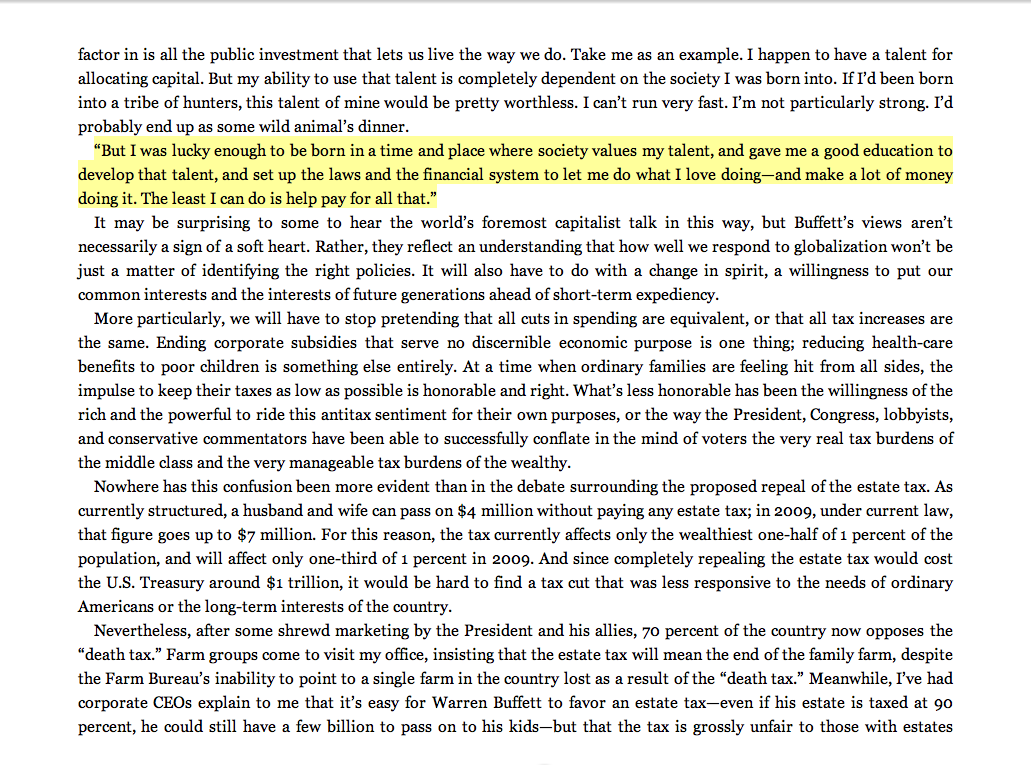 “ ‘But I was lucky enough to be born in a time and place where society values my talent, and gave me a good education to develop that talent, and set up the laws and the financial system to let me do what I love doing—and make a lot of money doing it. The least I can do is help pay for all that.’ ”