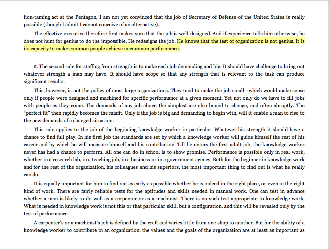 “[The effective executive] knows that the test of organization is not genius. It is its capacity to make common people achieve uncommon performance.”