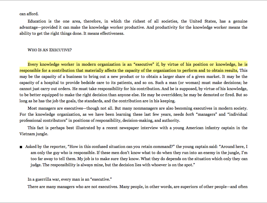 “Every knowledge worker in modern organization is an ‘executive’ if, by virtue of his position or knowledge, he is responsible for a contribution that materially affects the capacity of the organization to perform and to obtain results.”