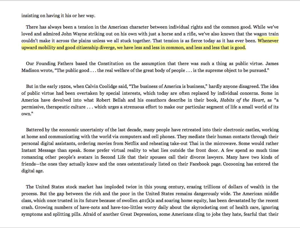 “Whenever upward mobility and good citizenship diverge, we have less and less in common, and less and less that is good.”