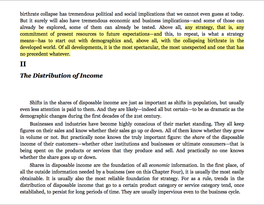 “Any strategy, that is, any commitment of present resources to future expectations . . . has to start out with demographics and, above all, with the collapsing birthrate in the developed world. Of all developments, it is the most spectacular, the most unexpected and one that has no precedent whatever.”