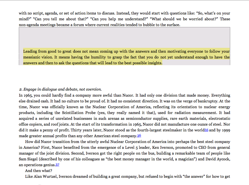 “Leading from good to great does not mean coming up with the answers and then motivating everyone to follow your messianic vision. It means having the humility to grasp the fact that you do not yet understand enough to have the answers and then to ask the questions that will lead to the best possible insights.”