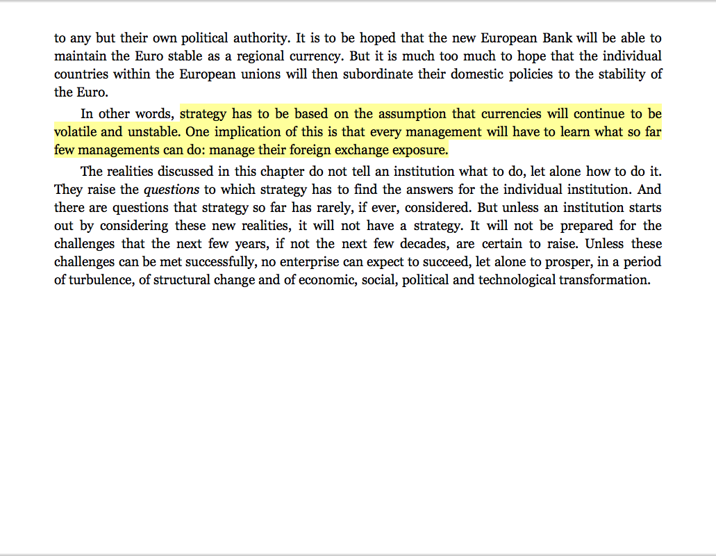 “Strategy has to be based on the assumption that currencies will continue to be volatile and unstable. One implication of this is that every management will have to learn what so far few managements can do: manage their foreign exchange exposure.”