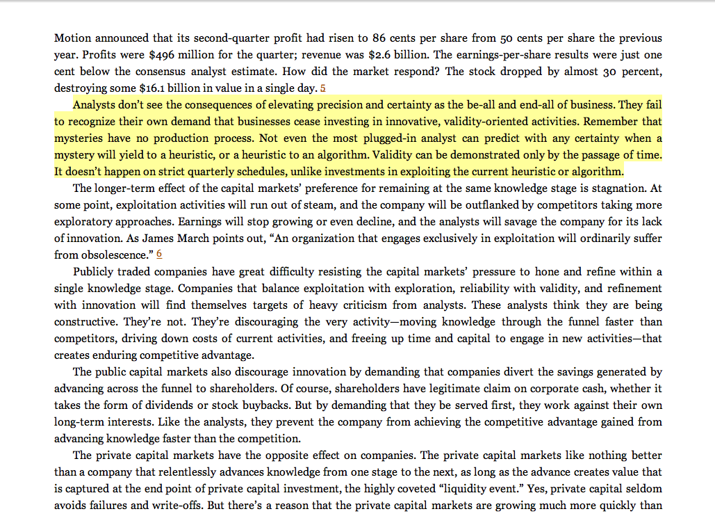 “Analysts don’t see the consequences of elevating precision and certainty as the be-all and end-all of business. They fail to recognize their own demand that businesses cease investing in innovative, validity-oriented activities. . . . Not even the most plugged-in analyst can predict with any certainty when a mystery will yield to a heuristic, or a heuristic to an algorithm. Validity can be demonstrated only by the passage of time. It doesn't happen on strict quarterly schedules, unlike investments in exploiting the current heuristic or algorithm.”