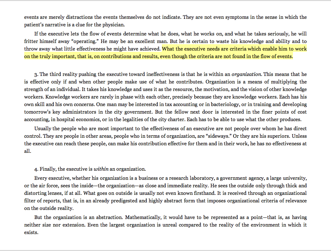 “What the executive needs are criteria which enable him to work on the truly important, that is, on contributions and results, even though the criteria are not found in the flow of events.”