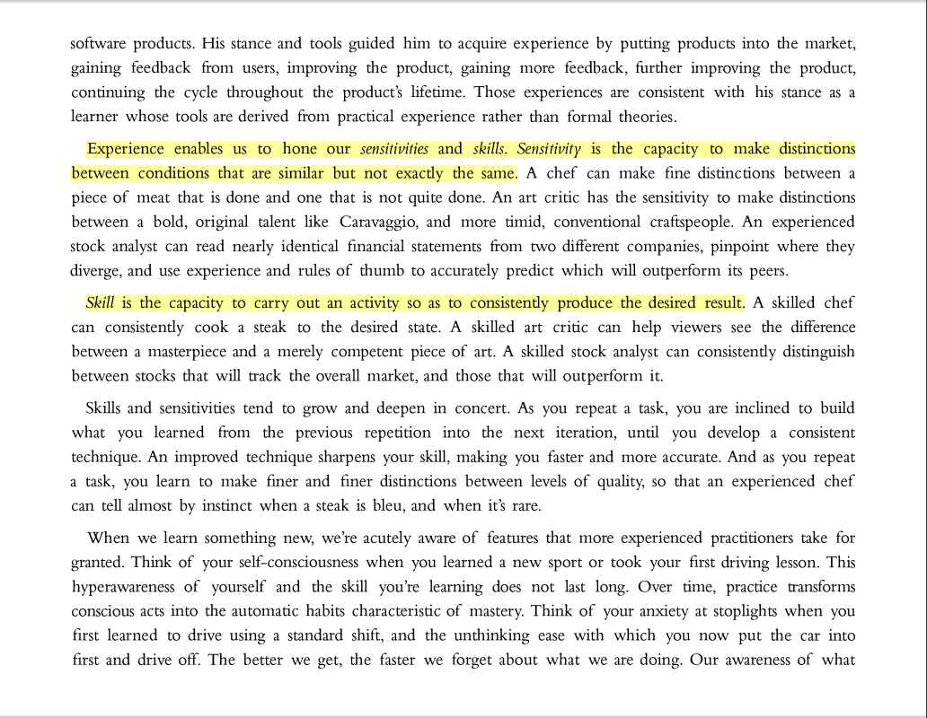 “Experience enables us to hone our sensitivities and skills. Sensitivity is the capacity to make distinctions between conditions that are similar but not exactly the same. . . . Skill is the capacity to carry out an activity so as to consistently produce the desired result.”