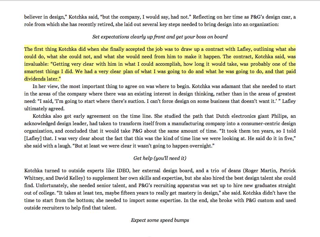 “The first thing [Claudia] Kotchka did when she finally accepted the job [at P&G] was to draw up a contract with [CEO A. G.] Lafley, outlining what she could do, what she could not, and what she would need from him to make it happen. The contract, Kotchka said, was invaluable: ‘Getting very clear with him in what I could accomplish, how long it would take, was probably one of the smartest things I did. We had a very clear plan of what I was going to do and what he was going to do, and that paid dividends later.’ ”