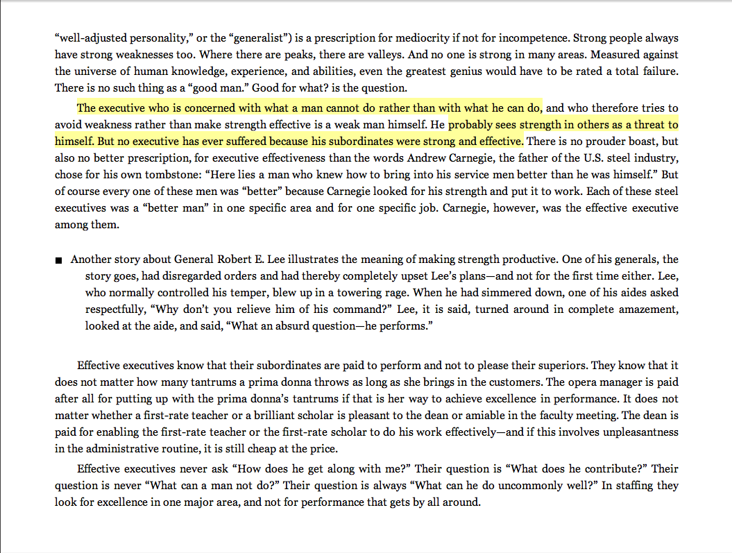 “The executive who is concerned with what a man cannot do rather than with what he can do . . . probably sees strength in others as a threat to himself. But no executive has ever suffered because his subordinates were strong and effective.”