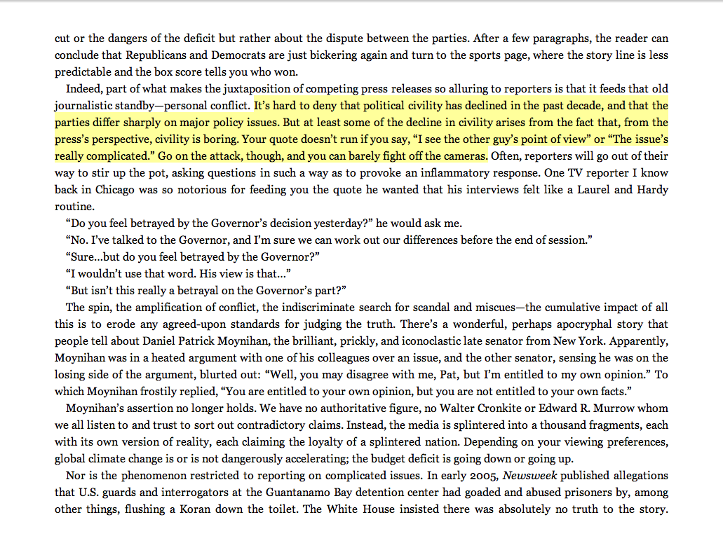 “It’s hard to deny that political civility has declined in the past decade, and that the parties differ sharply on major policy issues. But at least some of the decline in civility arises from the fact that, from the press’s perspective, civility is boring. Your quote doesn’t run if you say, ‘I see the other guy’s point of view’ or ‘The issue's really complicated.’ Go on the attack, though, and you can barely fight off the cameras.”