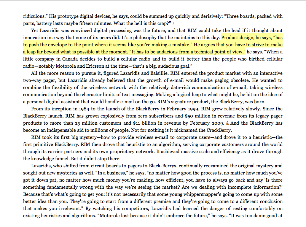 “Product design, [Lazaridis of RIM] says, ‘has to push the envelop to the point where it seems like you’re making a mistake.’ He argues that you have to strive to make a leap far beyond what is possible at the moment. ‘It has to be audacious from a technical point of view.’ ”