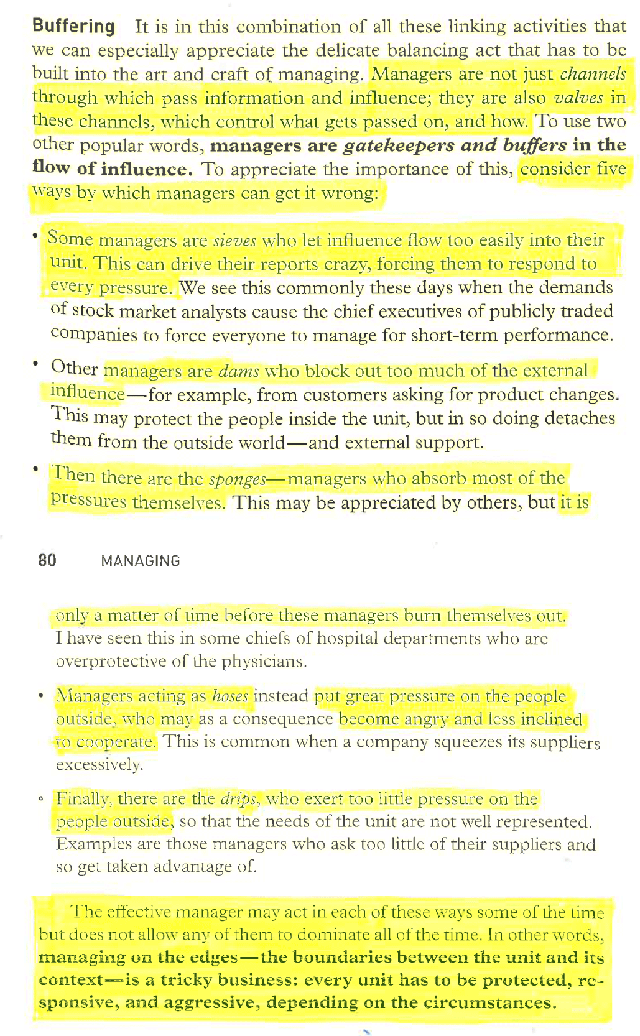 The effective manager may act in each of these ways some of the time but does not allow any of them to dominate all of the time. . . managing on the edges—the boundaries between the unit and its context?is a tricky business: every unit has to be protected, responsive, and aggressive, depending on the circumstances.”