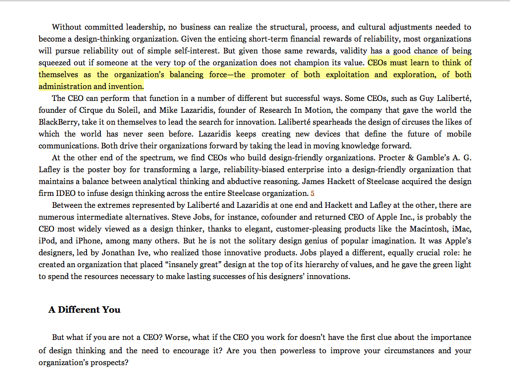 “CEOs must learn to think of themselves as the organization’s balancing force—the promoter of both exploitation and exploration, of both administration and invention.”