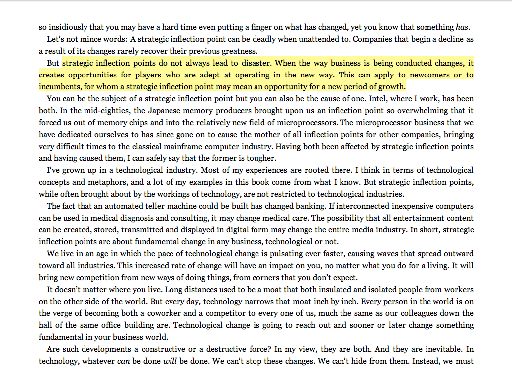 “Strategic inflection points do not always lead to disaster. When the way business is being conducted changes, it creates opportunities for players who are adept at operating in the new way. This can apply to newcomers or to incumbents, for whom a strategic inflection point may mean an opportunity for a new period of growth.”