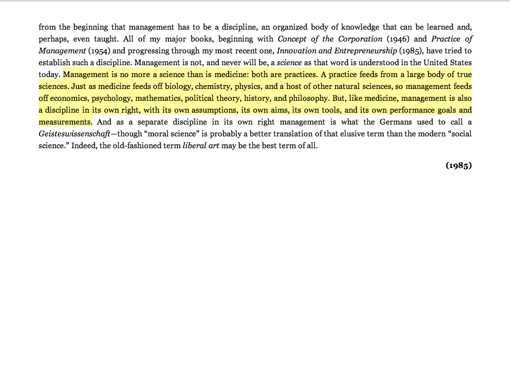 “Management is no more a science than is medicine: both are practices. A practice feeds from a large body of true sciences. Just as medicine feeds off biology, chemistry, physics, and a host of other natural sciences, so management feeds off economics, psychology, mathematics, political theory, history, and philosophy. But like medicine, management is also a discipline in its own right, with its own assumptions, it own aims, its own tools, and its own performance goals and measurements.”