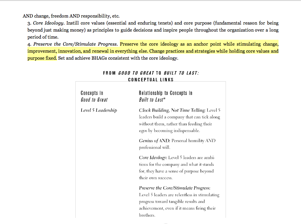 “Preserve the core ideology as an anchor point while stimulating change, improvement, innovation, and renewal in everything else. Change practices and strategies while holding core values and purpose fixed.”