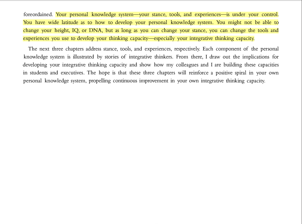 “Your personal knowledge system, your stance, tools and experience—is under your control. You have wide latitude as to how to develop your personal knowledge system. You might not be able to change your height, IQ, or DNA, but as long as you can change your stance, you can change the tools and experiences you use to develop your thinking capacity—especially your integrative thinking capacity.”