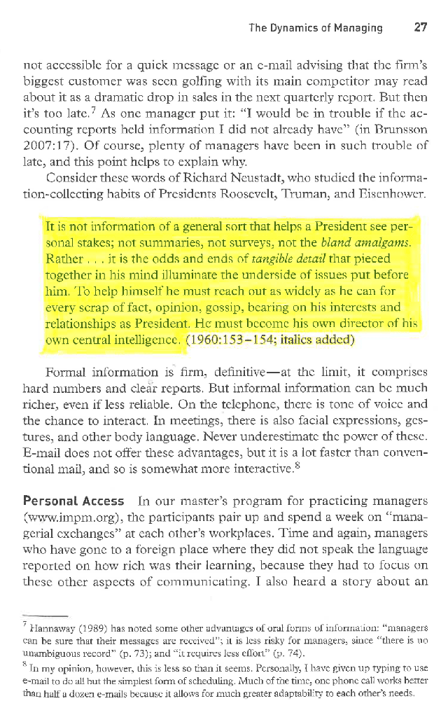 “It is not information of a general sort that helps a President see personal stakes; not summaries, not surveys, not the bland amalgams. Rather. . . It is the odds and ends of tangible detail that pieced together in his mind illuminate the underside of issues put before him. To help himself he must reach out as widely as he can for every scrap of fact, opinion, gossip, bearing on his interests and relationships as President. He must become his own director of his own central intelligence.”