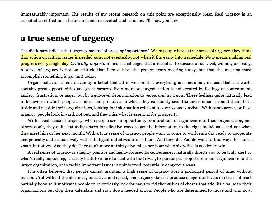 “When people have a true sense of urgency, they think that action on critical issues is needed now, not eventually, not when it fits easily into a schedule. Now means making real progress every day.”