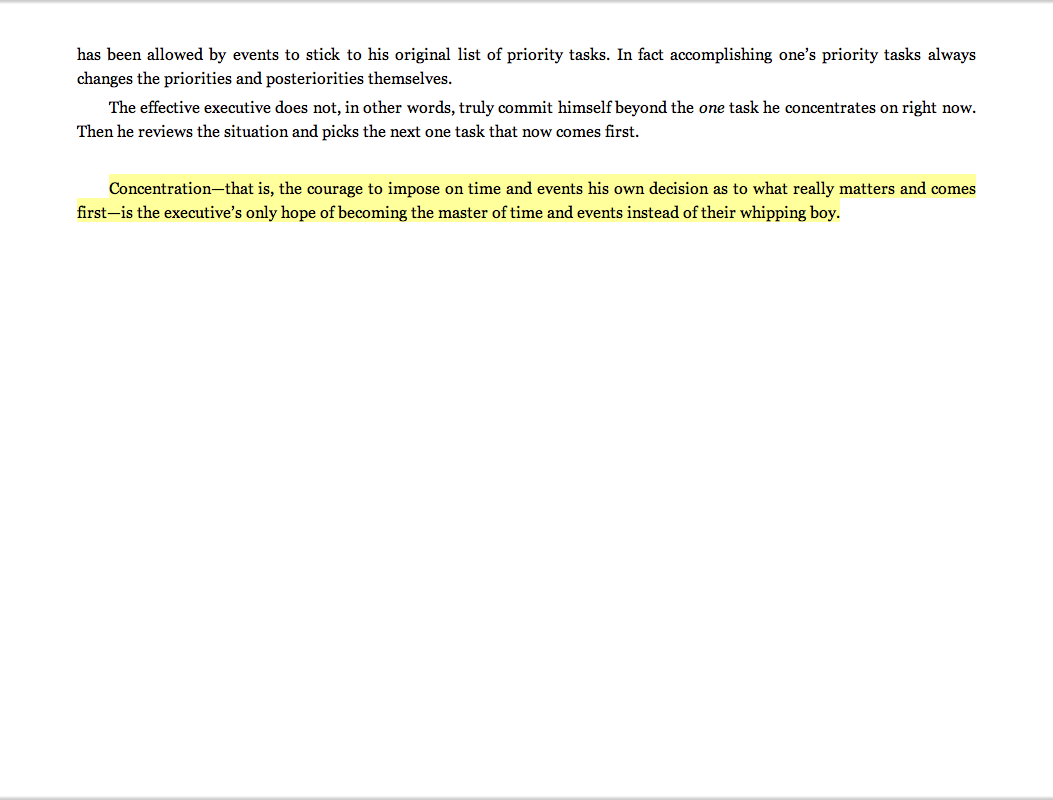“Concentration—that is, the courage to impose on time and events his own decision as to what really matters and comes first—is the executive’s only hope of becoming the master of time and events instead of their whipping boy.”