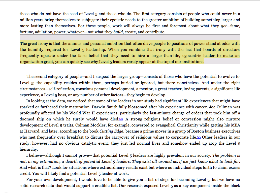 “The great irony is that the animus and personal ambition that often drive people to positions of power stand at odds with the humility required for Level 5 leadership. When you combine that irony with the fact that the boards of directors frequently operate under the false belief that they need to hire a larger-than-life, egocentric leader to make an organization great, you can quickly see why Level 5 leaders rarely appear at the top of our institutions.”