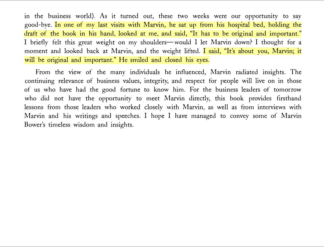 “In one of my last visits with Marvin [Bower], he sat up from his hospital bed, holding the draft of the book in his hand, looked at me, and said, ‘It has to be original and important.’ . . . I said, ‘It’s about you, Marvin; it will be original and important.’ He smiled and closed his eyes.”