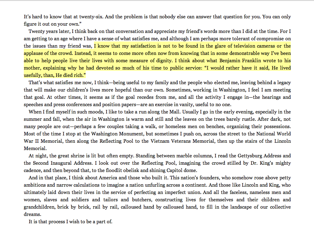 “I know that my satisfaction is not to be found in the glare of the television cameras or the applause of the crowd. Instead, it seems to come more often now from knowing that in some demonstrable way I’ve been able to help people live their lives with some measure of dignity. I think about what Benjamin Franklin wrote to his mother, explaining why he had devoted so much of his time to public service: ‘I would rather have it said, He lived usefully, than, He died rich.’ ”