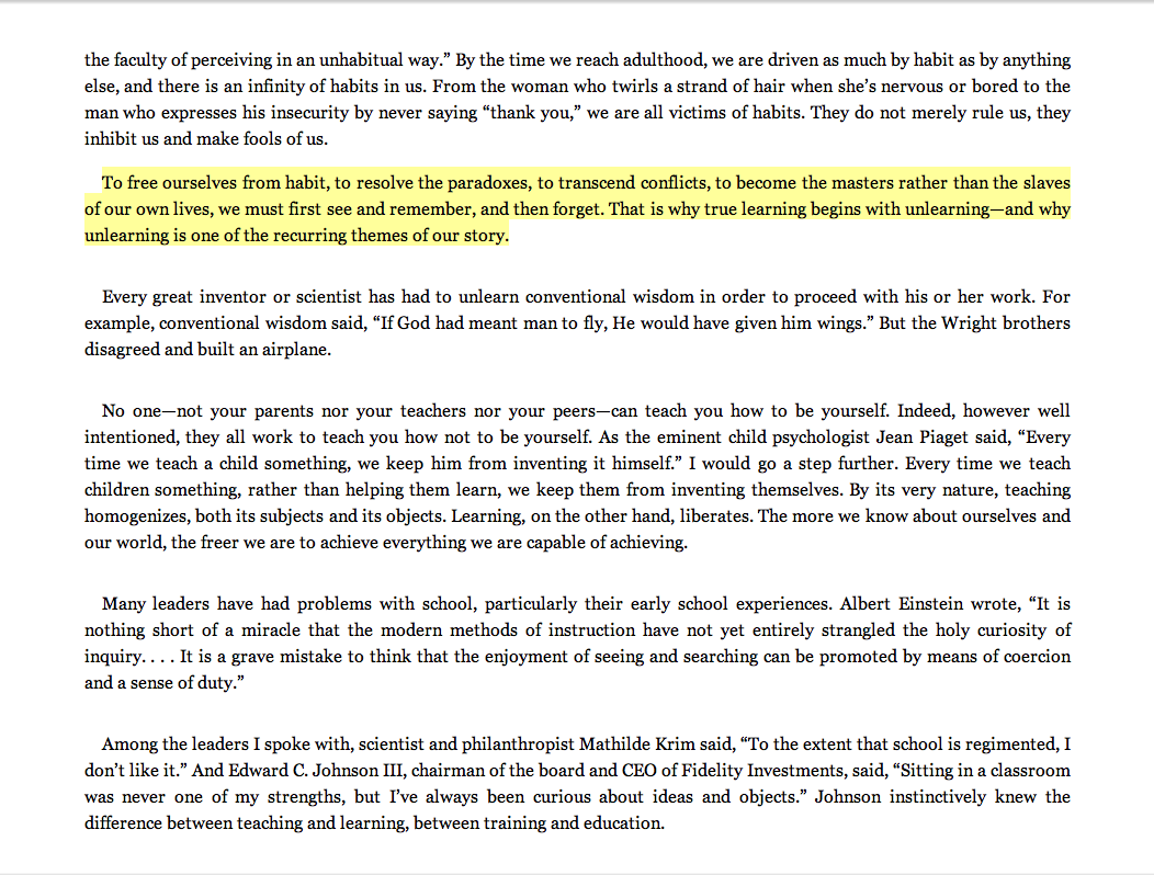 “To free ourselves from habit, to resolve the paradoxes, to transcend conflicts, to become the masters rather than the slaves of our own lives, we must first see and remember, and then forget. That is why true learning begins with unlearning—and why unlearning is one of the recurring themes of our story.”