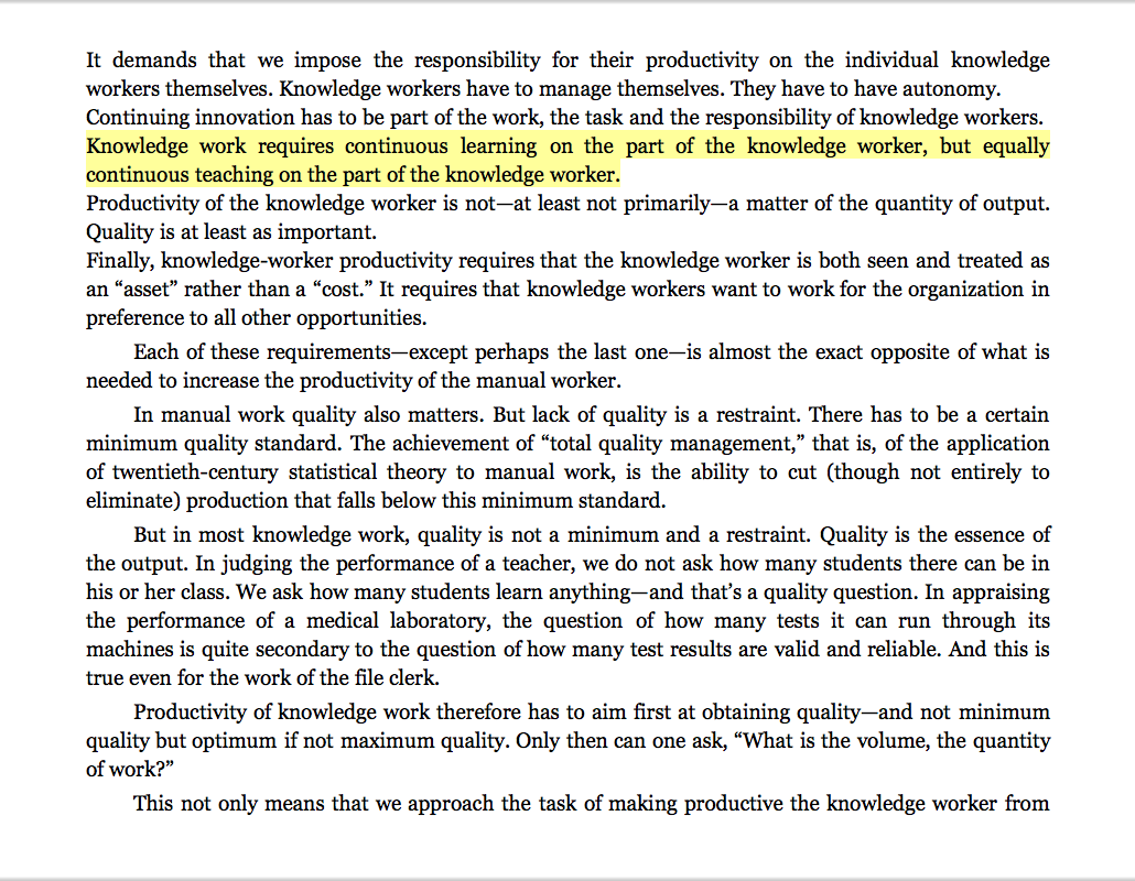 “Knowledge work requires [not only] continuous learning on the part of the knowledge worker, but equally continuous teaching on the part of the knowledge worker.”