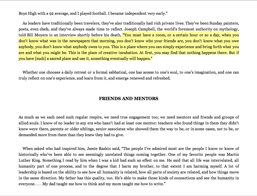 Joseph Campbell: “You must have a room. Or a certain hour or so a day, when you don’t know what was in the newspapers that morning, you don’t know who your friends are, you don’t know what you owe anybody, you don’t know what anybody owes to you. This is a place where you can simply experience and bring forth what you are and what you might be. This is the place of creative incubation. At first you may find that nothing happens there. But if you have [such] a sacred place and use it, something eventually will happen.”
