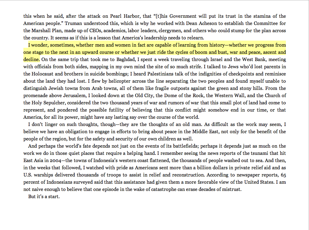 “I wonder, sometimes, whether men and women in fact are capable of learning from history—whether we progress from one stage to the next in an upward course or whether we just ride the cycles of boom and bust, war and peace, ascent and decline.”