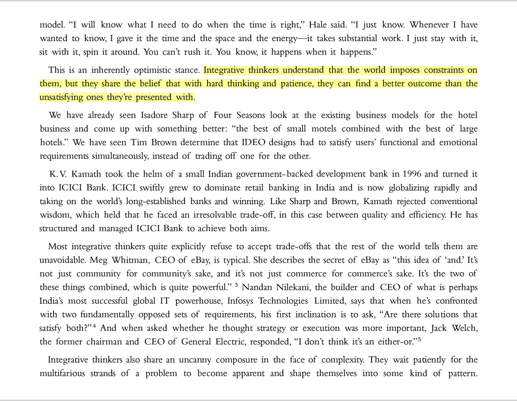 “Integrative thinkers understand that the world imposes constraints on them, but they share the belief that with hard thinking and patience, they can find a better outcome than the unsatisfying ones they’re presented with.”