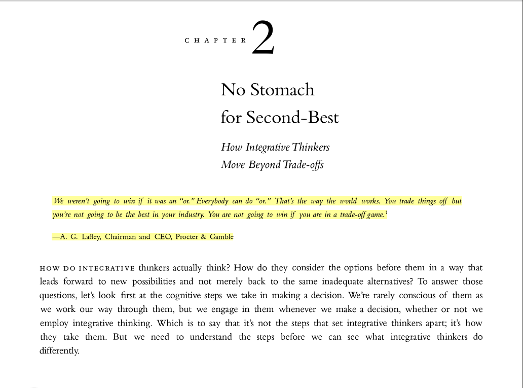 “We weren’t going to win if it was an ‘or.’ Everybody can do ‘or.’ That’s the way the world works. You trade things off but you’re not going to be the best in your industry. You are not going to win if you are in a trade-off game.” —A. G. Lafley, former chairman and CEO, Procter & Gamble