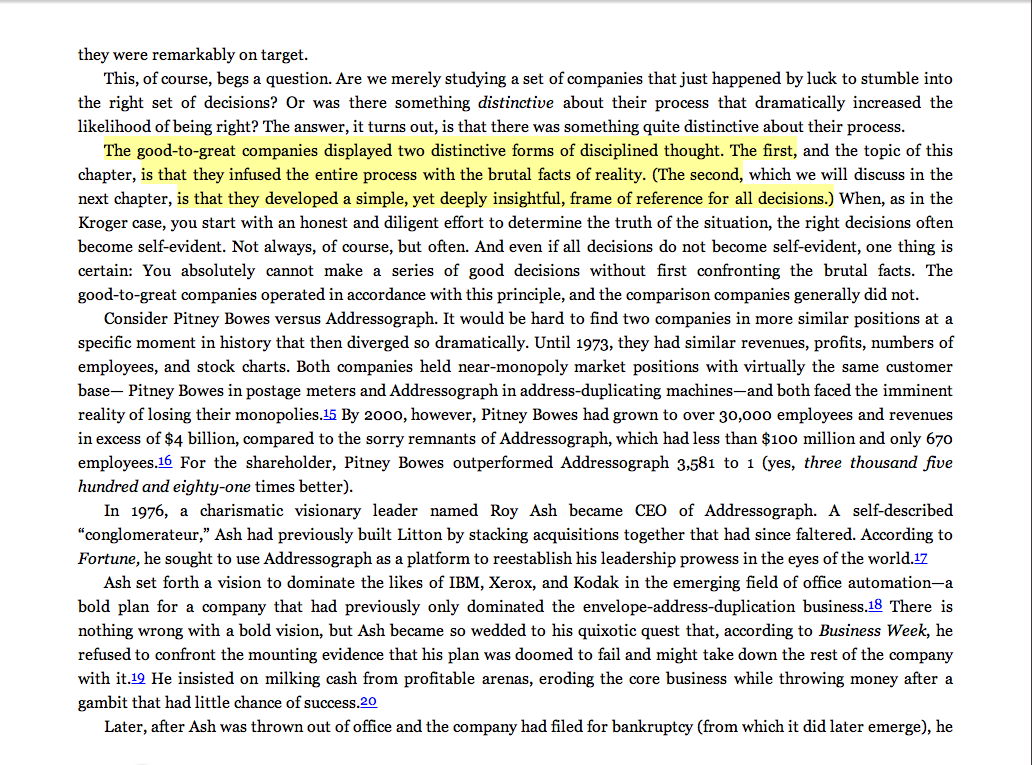 “The good-to-great companies displayed two distinctive forms of disciplined thought. The first . . . is that they infused the entire process with the brutal facts of reality. (The second . . . is that they developed a simple, yet deeply insightful, frame of reference for all decisions.)”