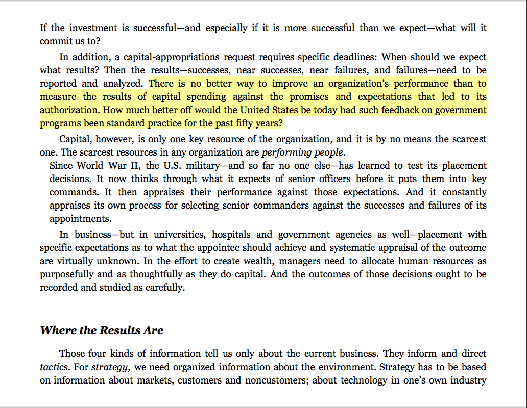 “There is no better way to improve an organization’s performance than to measure the results of capital spending against the promises and expectations that led to its authorization. How much better off would the United States be today had such feedback on government programs been standard practice for the past fifty years?”