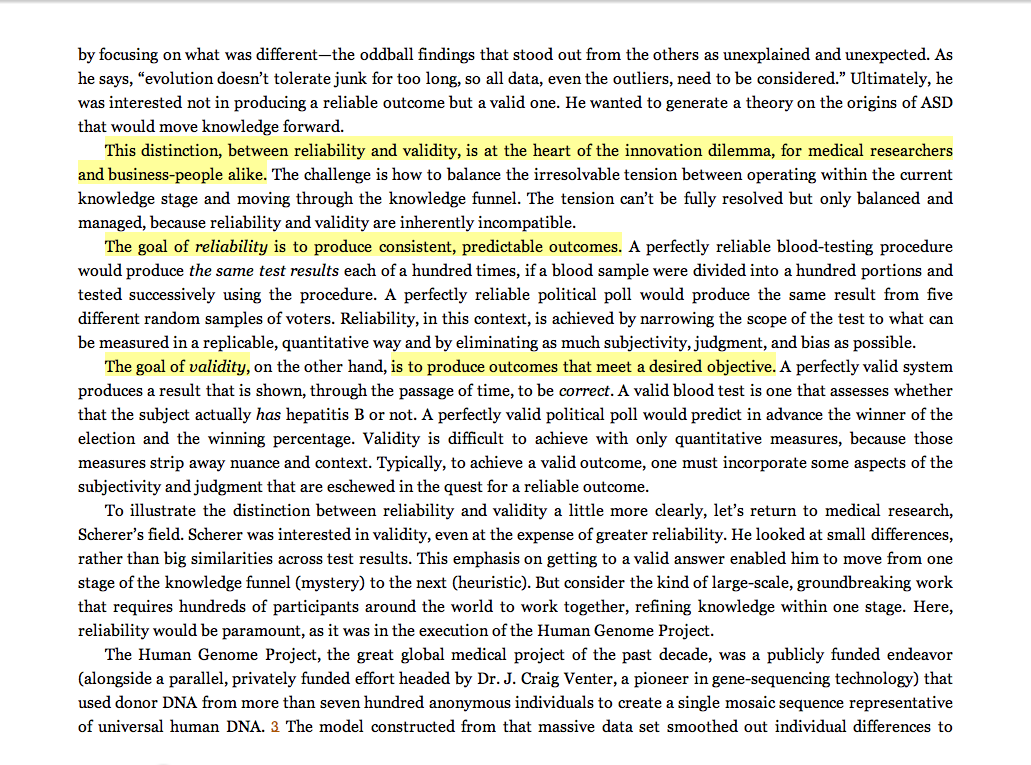 “This distinction, between reliability and validity, is at the heart of the innovation dilemma, for medical researchers and business-people alike. . . .