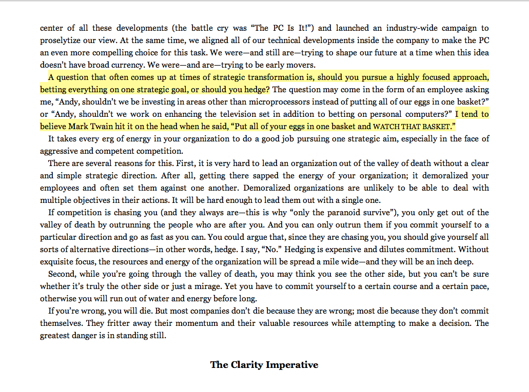 “A question that often comes up at times of strategic transformation is, should you pursue a highly focused approach, betting everyone on one strategic goal, or should you hedge? I tend to believe Mark Twain hit it on the head when he said, ‘Put all of your eggs in one basket and WATCH THAT BASKET.’”