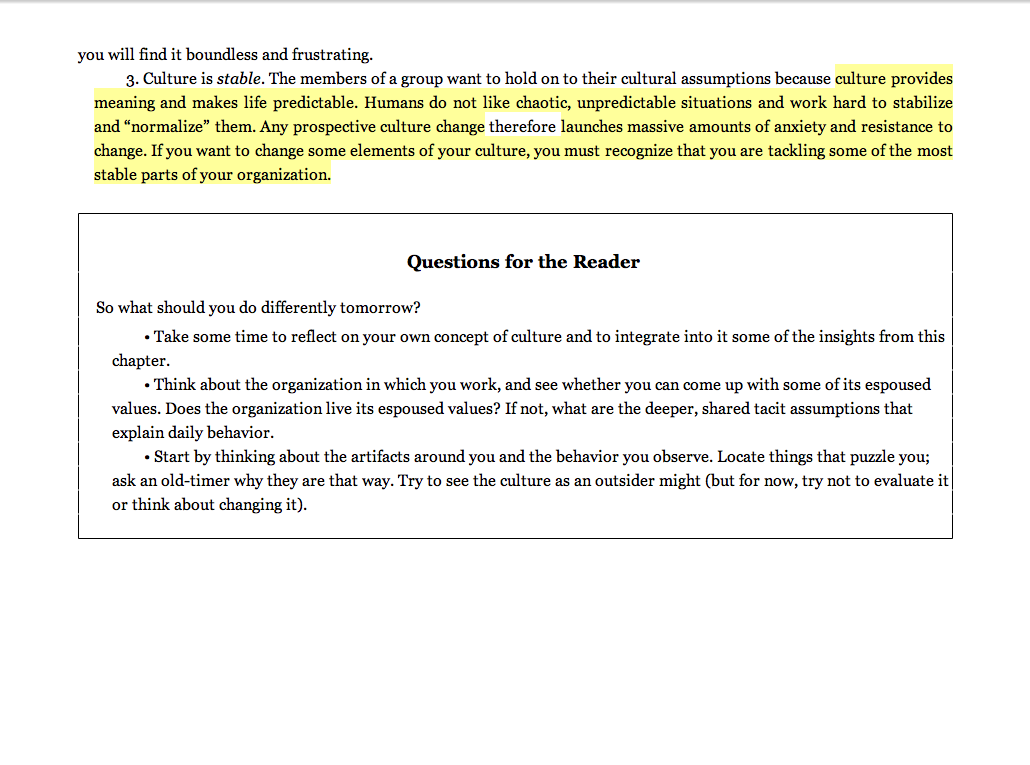 “Culture provides meaning and makes life predictable. Humans do not like chaotic, unpredictable situations and work hard to stabilize and ‘normalize’ them. Any prospective culture change . . . launches massive amounts of anxiety and resistance to change. If you want to change some elements of your culture, you must recognize that you are tackling some of the most stable parts of your organization.”