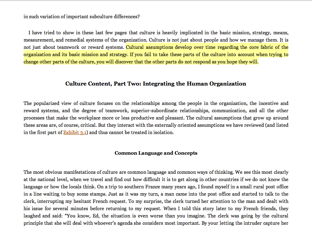 “Cultural assumptions develop over time regarding the core fabric of the organization and its basic mission and strategy. If you fail to take these parts of the culture into account when trying to change other parts of the culture, you will discover that the other parts do not respond as you hope they will.”
