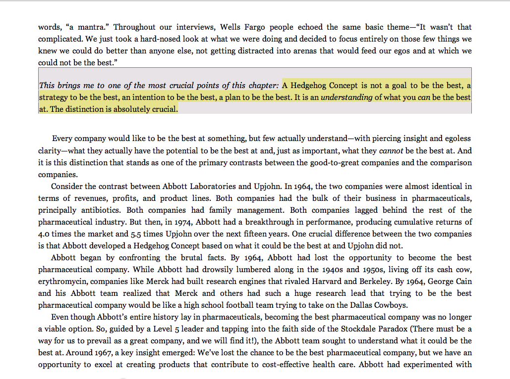 “A Hedgehog Concept is not a goal to be the best, a strategy to be the best, an intention to be the best, a plan to be the best. It is an understanding of what you can be the best at. The distinction is absolutely crucial.”