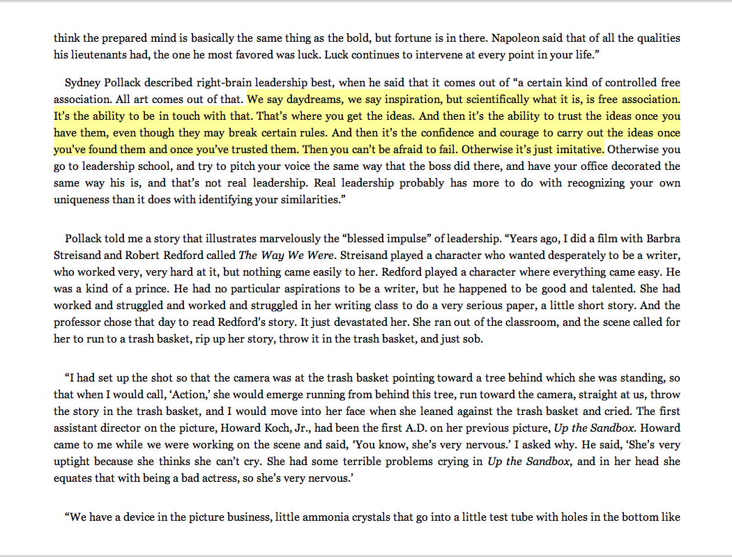 “We say daydreams, we say inspiration, but scientifically what it is, is free association. It’s the ability to be in touch with that. That’s where you get the ideas. And then it’s the ability to trust the ideas once you have them, even though they may break certain rules. And then it’s the confidence and courage to carry out the ideas once you’ve found them and once you’ve trusted them. Then you can’t be afraid to fail. Otherwise it’s just imitative.”