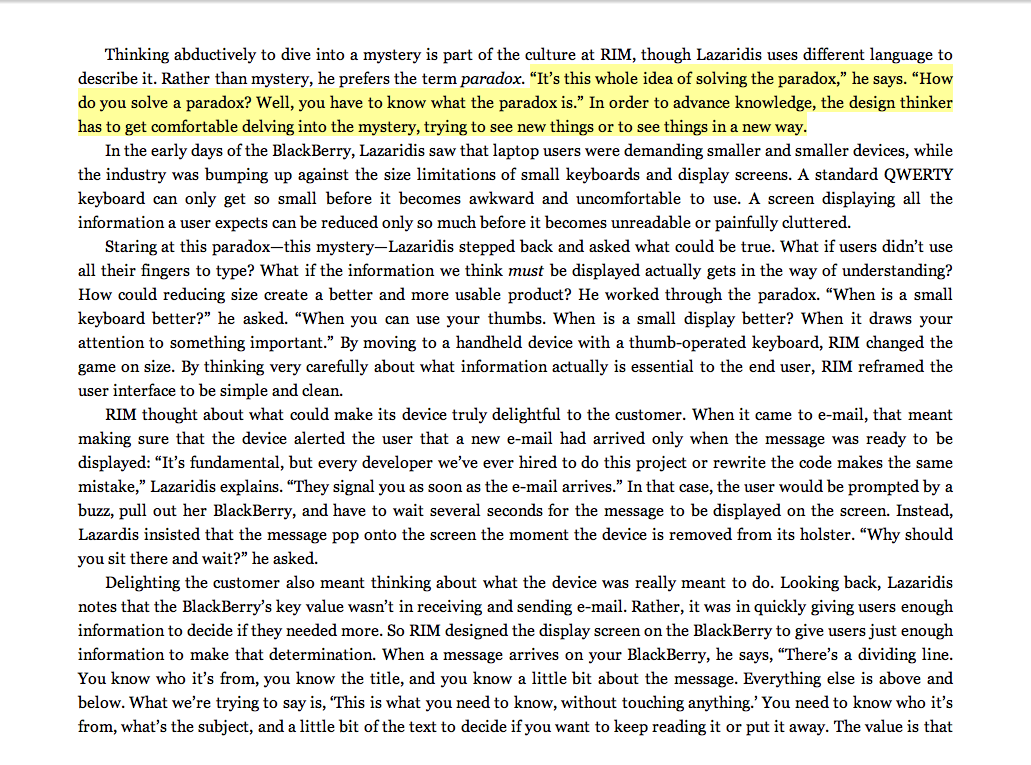 “ ‘It’s this whole idea of solving the paradox,’ [Lazaridis] says. ‘How do you solve a paradox? Well, you have to know what the paradox is.’ In order to advance knowledge, the design thinker has to get comfortable delving into the mystery, trying to see new things or to see things in a new way.”