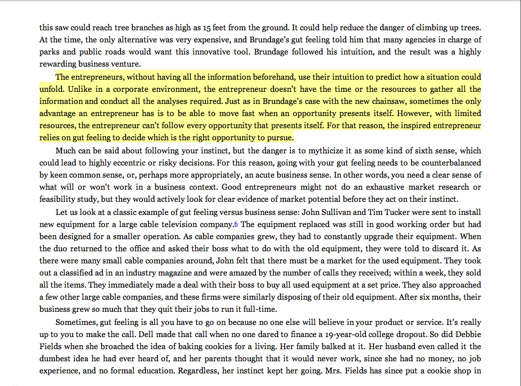 “The entrepreneurs, without having all the information beforehand, use their intuition to predict how a situation could unfold. Unlike in a corporate environment, the entrepreneur doesn’t have the time or the resources to gather all the information and conduct all the analyses required. . . . Sometimes the only advantage an entrepreneur has is to be able to move fast when an opportunity presents itself. However, with limited resources, the entrepreneur can’t follow every opportunity that presents itself. For that reason, the inspired entrepreneur relies on gut feeling to decide which is the right opportunity to pursue.”