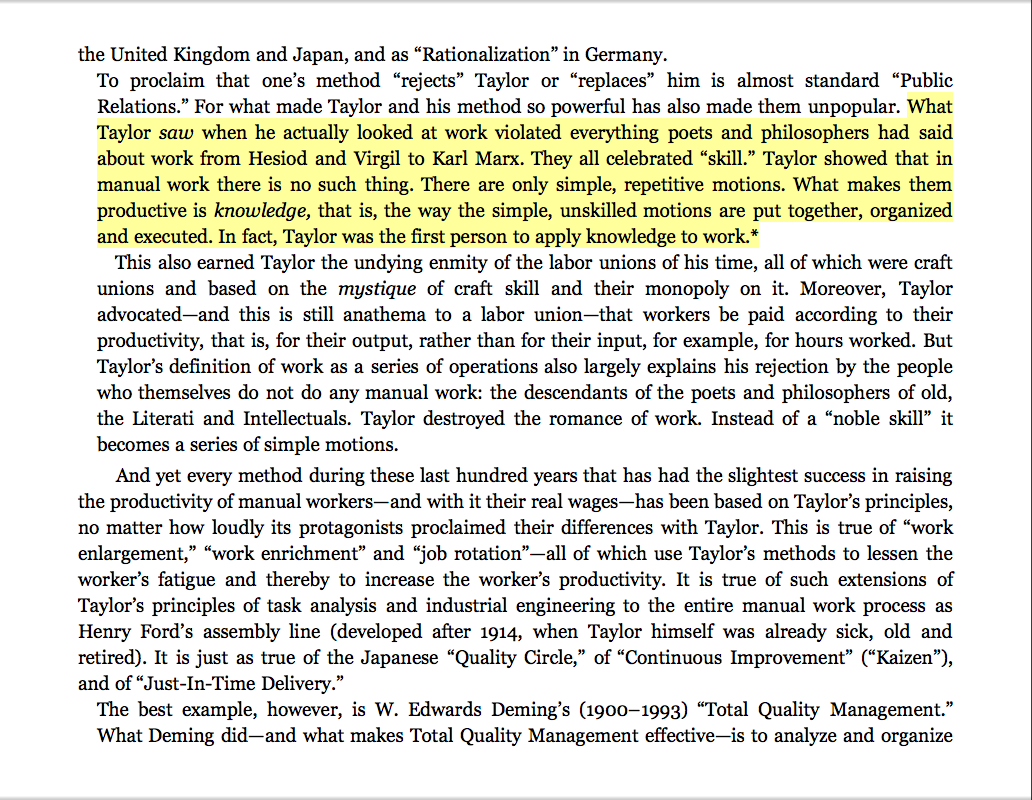 Taylor showed that in manual work there is no such thing. There are only simple, repetitive motions. What makes them productive is knowledge, that is, the way the simple, unskilled motions are put together, organized and executed.