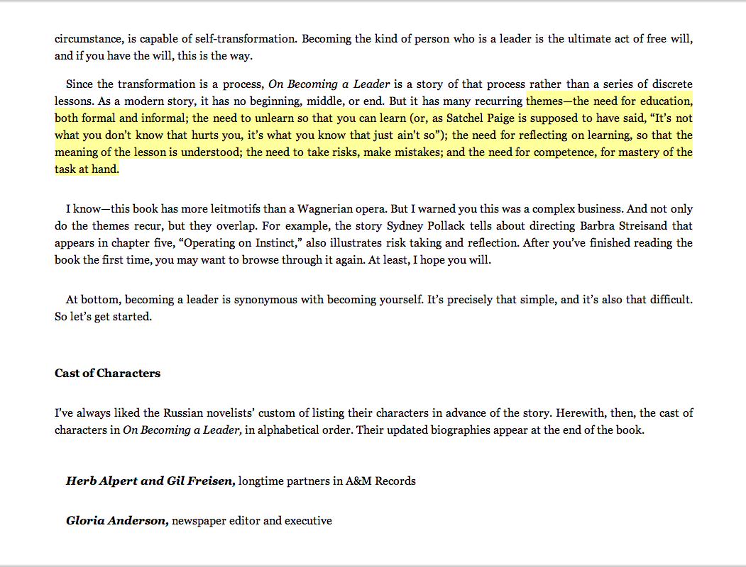 “The need for education, both formal and informal; the need to unlearn so that you can (or, as Satchel Paige is supposed to have said, ‘it’s not what you don’t know that hurts you, it’s what you know that just ain’t so’); the need for reflecting on learning, so that the meaning of the lesson is understood; the need to take risks, make mistakes; and the need for competence, for mastery of the task at hand.”