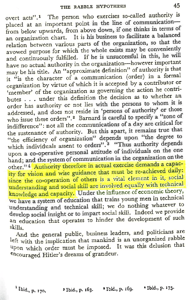 “Authority therefore in actual exercise demands a capacity for vision and wise guidance that must be re-achieved daily: since the cooperation of others is a vital element in it, social understanding and social skill are involved equally with technical knowledge and capacity.”