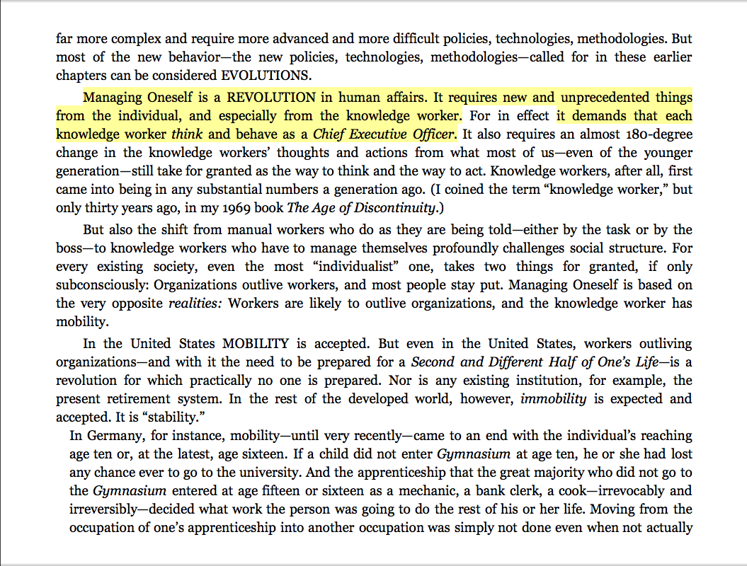 “Managing Oneself is a REVOLUTION in human affairs. It requires new and unprecedented things from the individual, and especially from the knowledge worker. . . . It demands that each knowledge worker think and behave as a Chief Executive Officer.”
