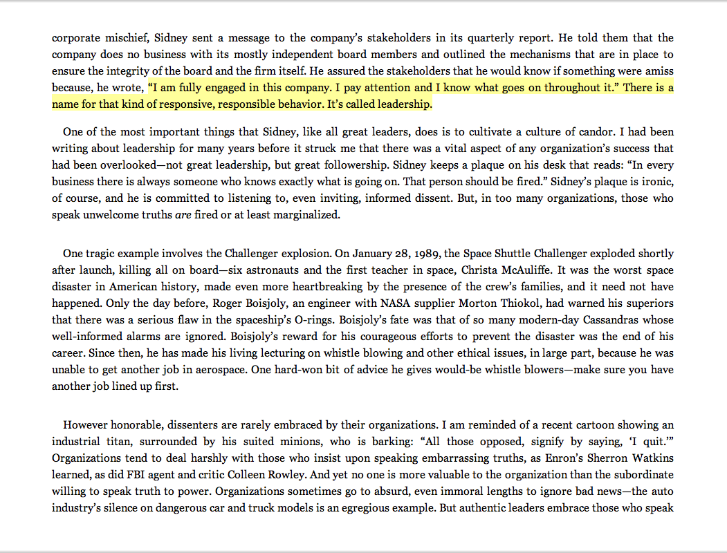 “‘I am fully engaged in this company. I pay attention and I know what goes on throughout it.’ There is a name for that kind of responsive, responsible behavior. It’s called leadership.”