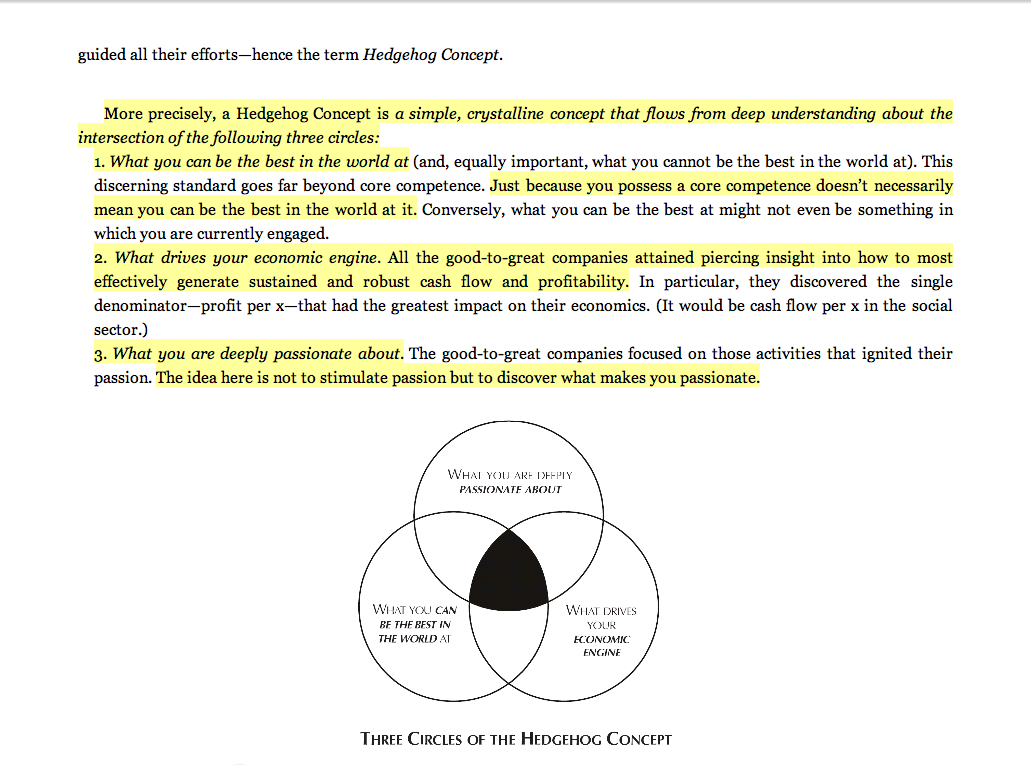 “A Hedgehog Concept is a simple, crystalline concept that flows from deep understanding about the intersection of the following three circles:
